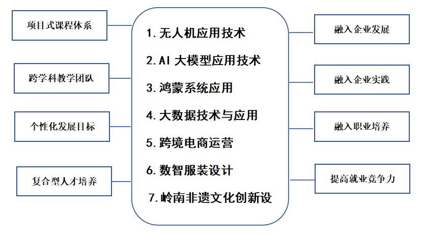 为了顺应时代的发展,满足交叉学科学习的需求,学校积极与行业龙头合作开展微专业课程,目前面向在校生开设了无人机应用技术、AI大模型应用技术、鸿蒙系统应用、大数据技术与应用、跨境电商运营、数智服装设计、岭南非遗文化创新设等七个微专业。在教学方式上,通过面授讲课、案例分析与实战操作相结合的授课方式,聘请企业家或行业专家、技术人员现场教学,让学生有更多的实践机会,进一步增强学生就业能力和创新创业能力,为粤港澳大湾区、珠三角地区以及广东的社会经济培养具有职业基础、较强动手能力、始终站在行业前沿的复合型人才。